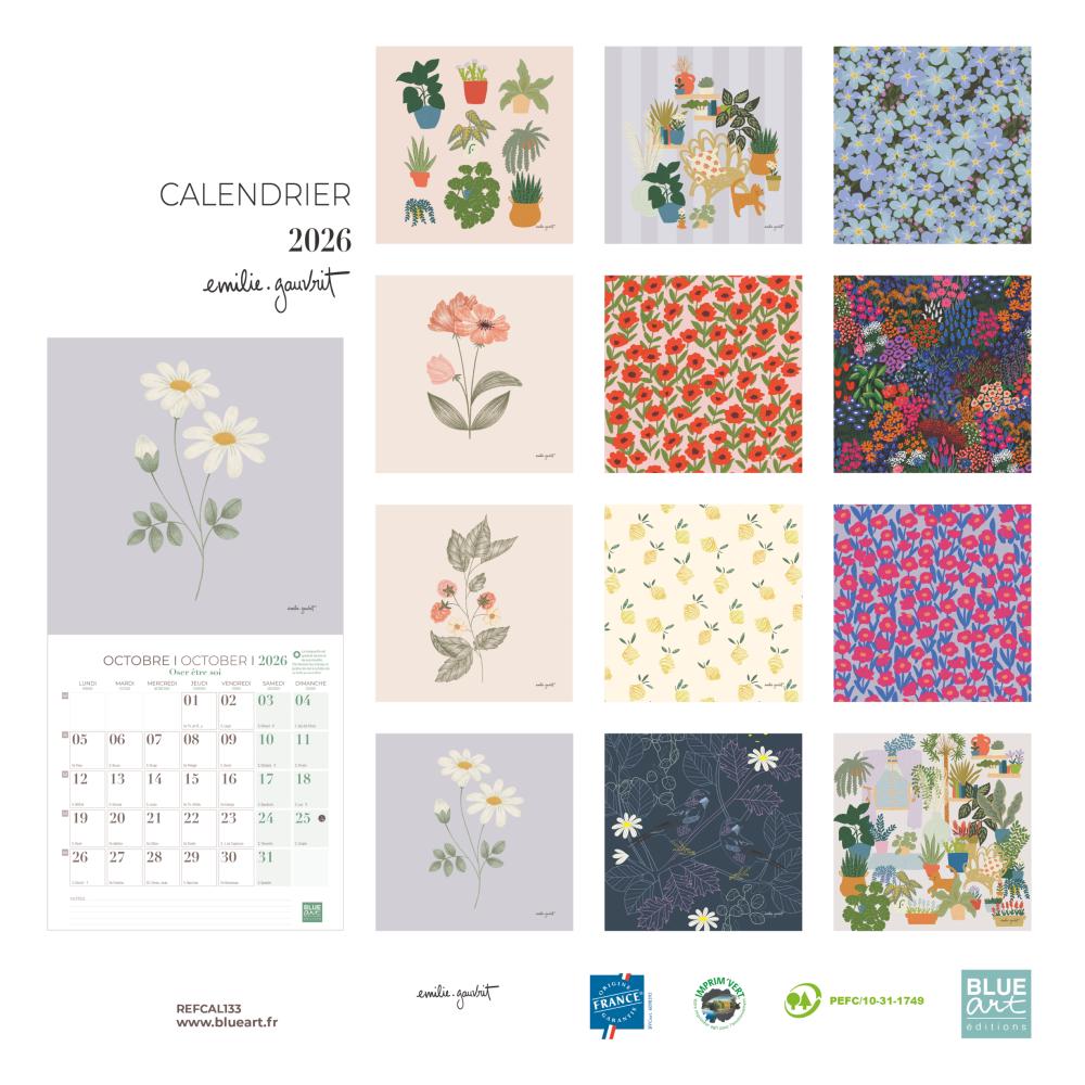 Calendrier mural 2026 Le langage des Fleurs Emilie Gauvrit 12 illustrations 30X30 cm Blue Art Editions