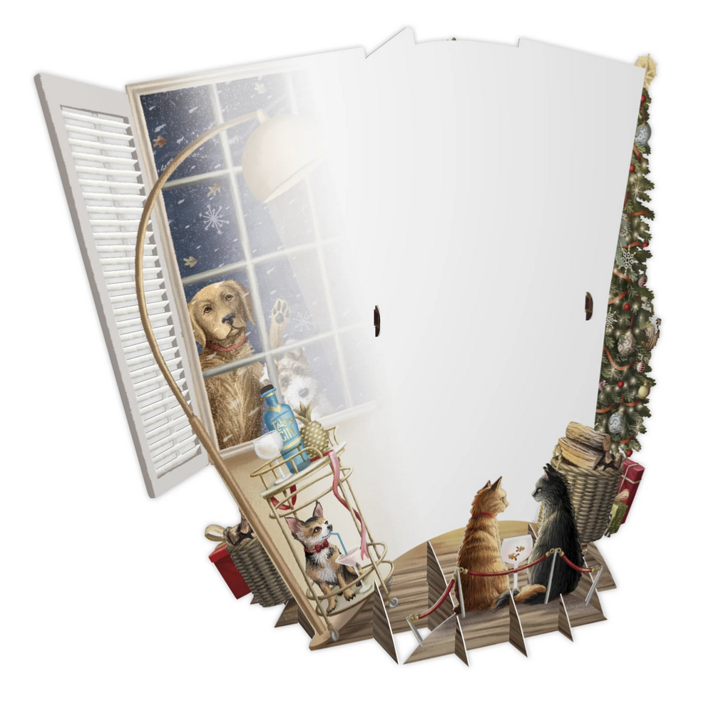 Avec cette carte pop up vous envoyez bien plus qu'un message, vous envoyez une surprise. Cette carte en relief est livrée avec une enveloppe pour que vous puissiez l'expédier par la poste. Inscrivez votre message au dos de la carte sur l'espace blanc prévu pour cela et glissez la carte 3D dans l'enveloppe. A l'ouverture, votre correspondant dépliera naturellement et très facilement la carte. Il obtiendra un décor d'un salon de Noël chaleureux avec nos animaux a poils préférés (chiens et chats) lors de cette fête de fin d'année, tenant seul à la verticale. Ce décor sur le thème de Noëlse compose de 7 plans très finement découpés et imprimés en couleur avec une grande finesse d’impression et de très nombreux détails. Un décor miniature époustouflant qu'on ne se lasse pas de regarder !