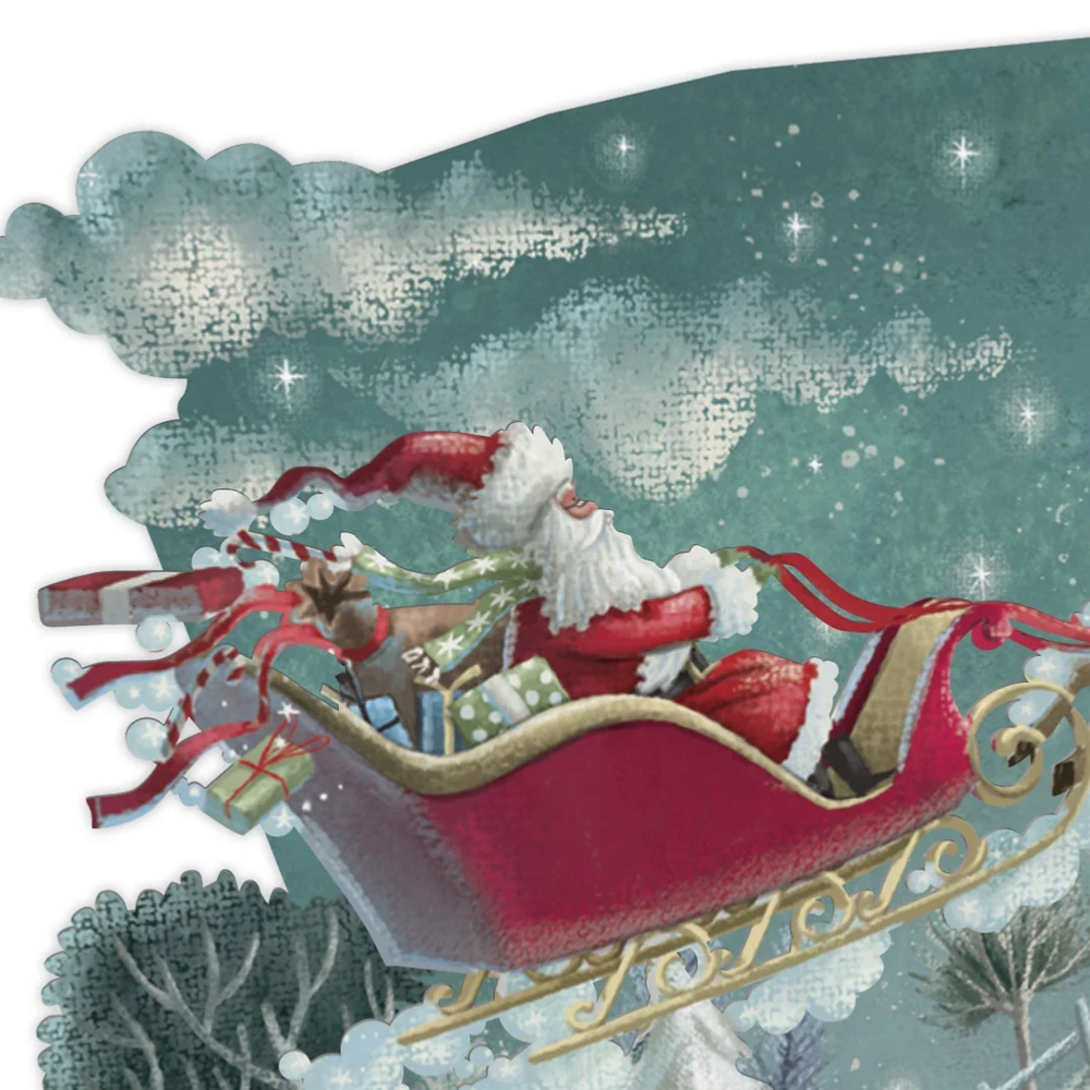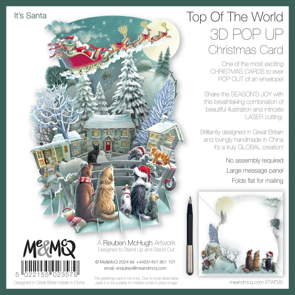 Avec cette carte pop up vous envoyez bien plus qu'un message, vous envoyez une surprise. Cette carte en relief est livrée avec une enveloppe pour que vous puissiez l'expédier par la poste. Inscrivez votre message au dos de la carte sur l'espace blanc prévu pour cela et glissez la carte 3D dans l'enveloppe. A l'ouverture, votre correspondant dépliera naturellement et très facilement la carte.  Il obtiendra un décor mignon et féerique, du Père-Noël et de son traineau survolant un village enneigé admiré par les animaux domestique, tenant seul à la verticale.. Ce décor sur le thème de Noël se compose de 7 plans très finement découpés et imprimés en couleur avec une grande finesse d’impression et de très nombreux détails. Un décor miniature époustouflant qu'on ne se lasse pas de regarder !