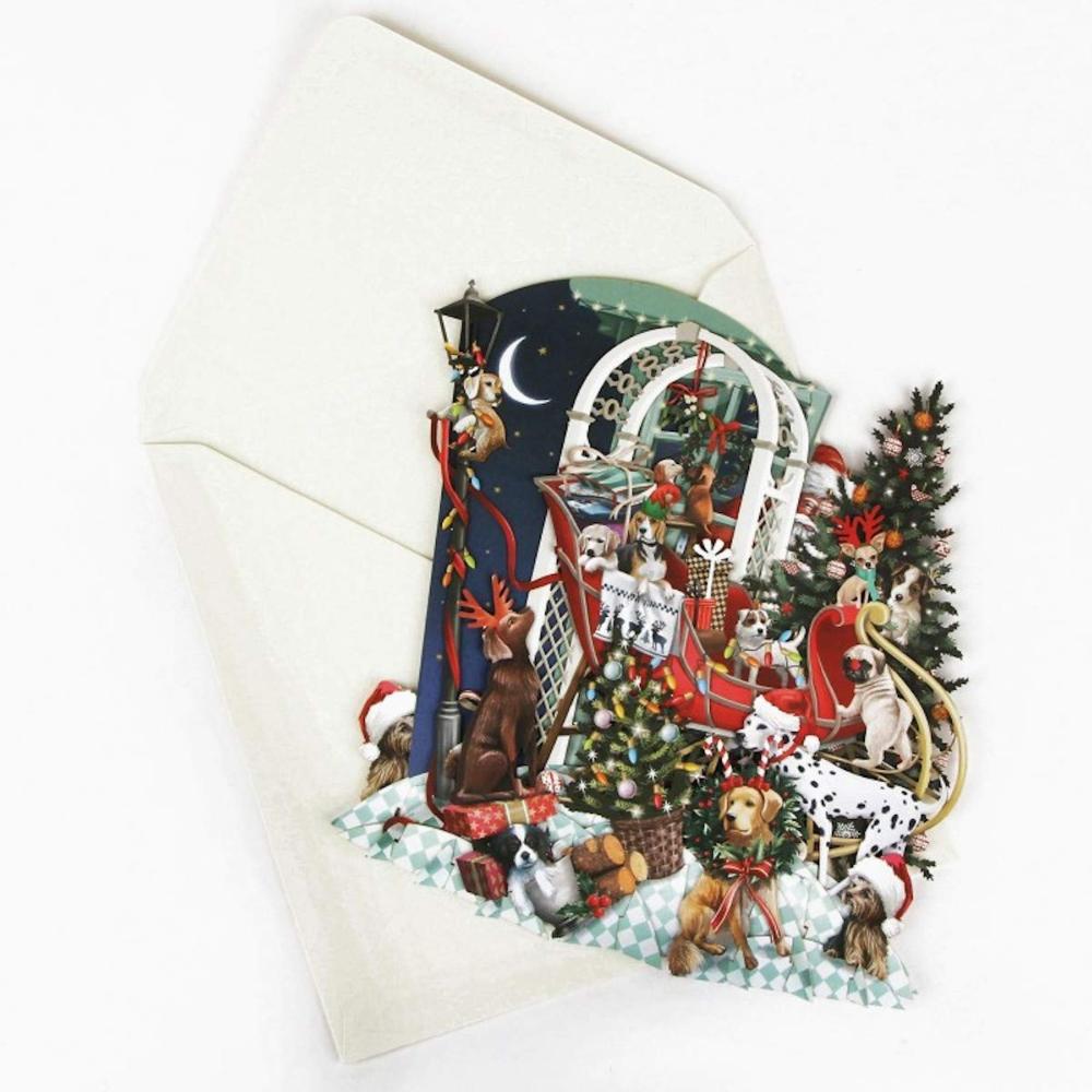 Avec cette carte pop up vous envoyez bien plus qu'un message, vous envoyez une surprise. Cette carte en relief est livrée avec une enveloppe pour que vous puissiez l'expédier par la poste. Inscrivez votre message au dos de la carte sur l'espace blanc prévu pour cela et glissez la carte 3D dans l'enveloppe. A l'ouverture, votre correspondant dépliera naturellement et très facilement la carte. Il obtiendra un décor de noël surprenant, tenant seul à la verticale. Ce décor sur le thème de Noël et des chiens se compose de 7 plans très finement découpés et imprimés en couleur avec une grande finesse d’impression et de très nombreux détails. Un décor miniature époustouflant qu'on ne se lasse pas de regarder !
