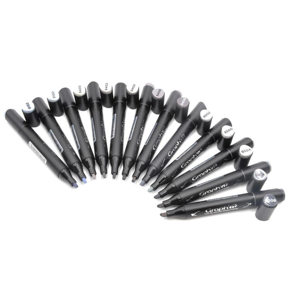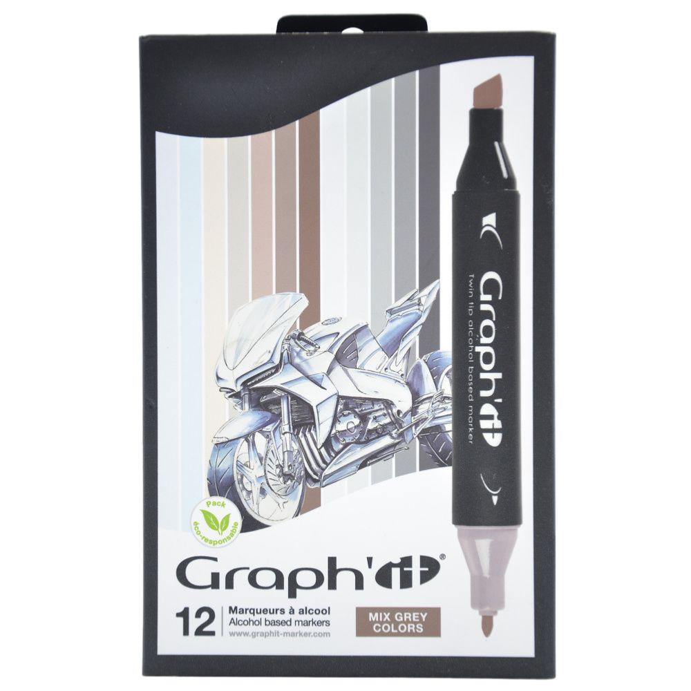 Feutres Graph'It 12 couleurs Mix Grey Marqueurs à Alcool Double-Pointe Biseau et Fine